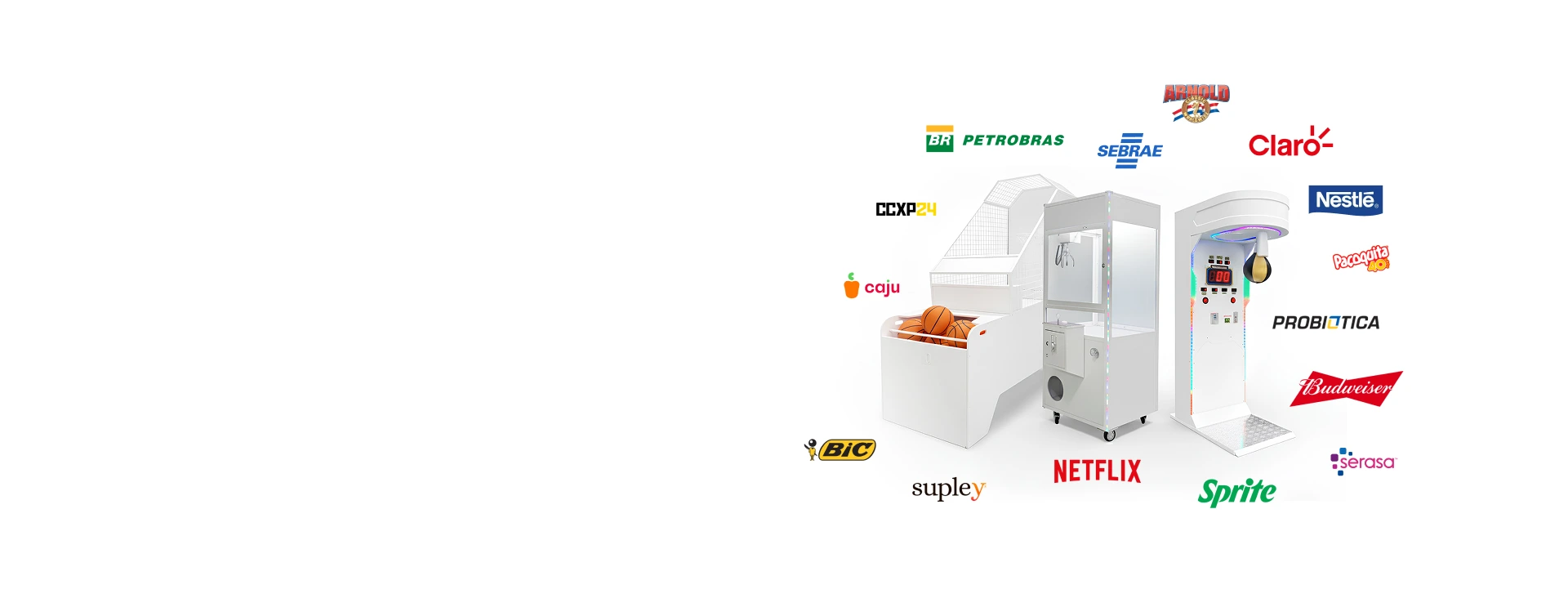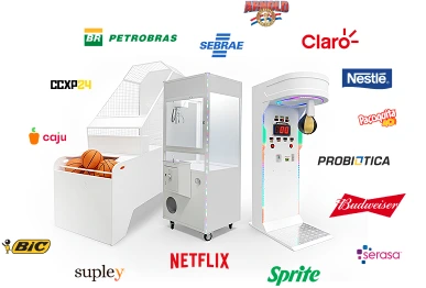 Cabines de vento, gruas de ursinho, simuladores de boxe e basquete e muito mais – tudo personalizado para a sua marca e entregue com a precisão da Garra Gigante.